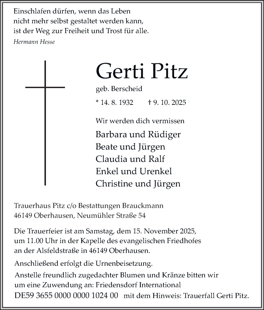 Hier finden Sie alle Traueranzeigen aus der Zeitung, die bisher für Gerti Pitz erschienen sind. Weitere Traueranzeigen, die in der Zeitung erscheinen, werden hier ebenfalls aufgelistet