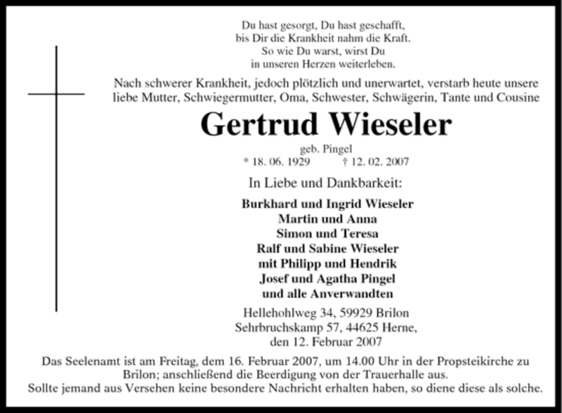 Hier finden Sie alle Traueranzeigen aus der Zeitung, die bisher für Gertrud Wieseler erschienen sind. Weitere Traueranzeigen, die in der Zeitung erscheinen, werden hier ebenfalls aufgelistet