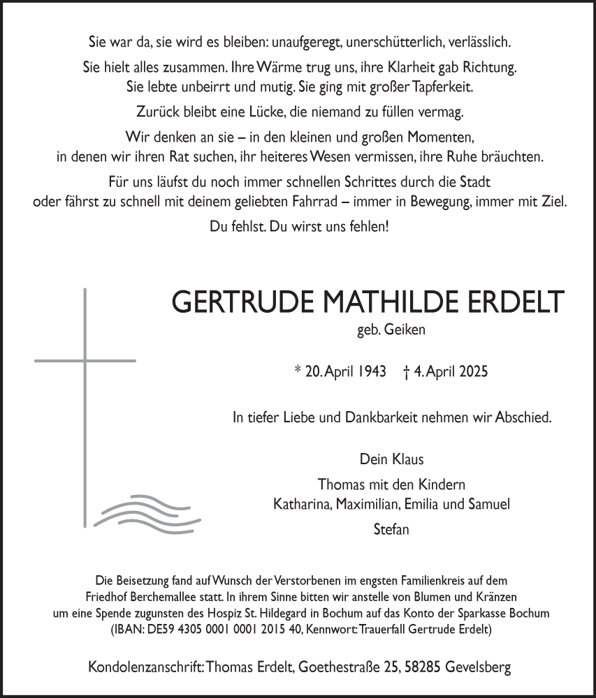 Hier finden Sie alle Traueranzeigen aus der Zeitung, die bisher für Gertrude Mathilde Erdelt erschienen sind. Weitere Traueranzeigen, die in der Zeitung erscheinen, werden hier ebenfalls aufgelistet