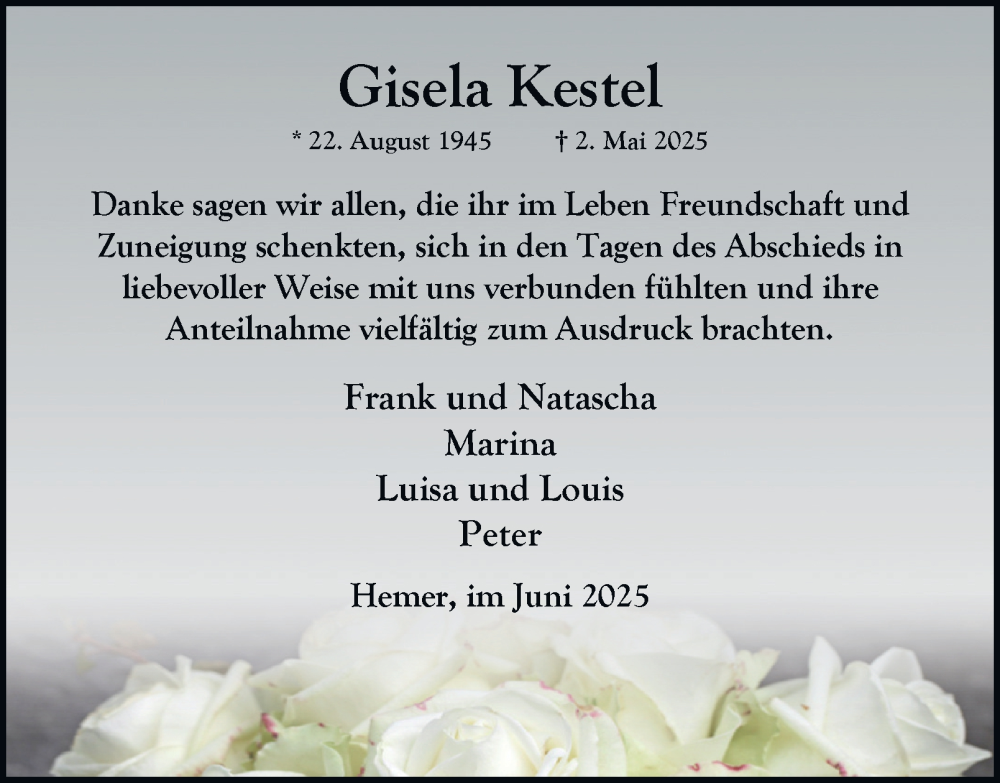 Hier finden Sie alle Traueranzeigen aus der Zeitung, die bisher für Gisela Kestel erschienen sind. Weitere Traueranzeigen, die in der Zeitung erscheinen, werden hier ebenfalls aufgelistet