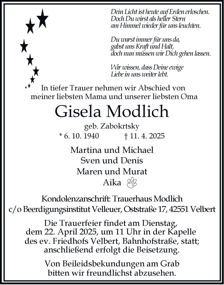 Hier finden Sie alle Traueranzeigen aus der Zeitung, die bisher für Gisela Modlich erschienen sind. Weitere Traueranzeigen, die in der Zeitung erscheinen, werden hier ebenfalls aufgelistet