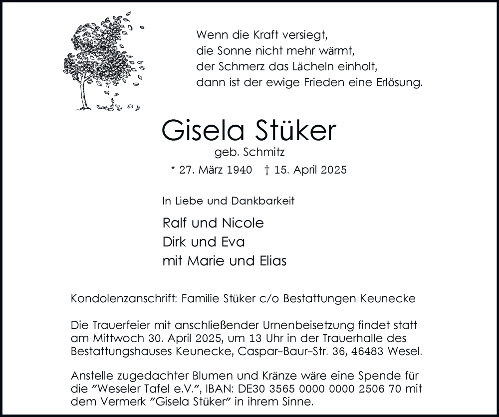 Hier finden Sie alle Traueranzeigen aus der Zeitung, die bisher für Gisela Stüker erschienen sind. Weitere Traueranzeigen, die in der Zeitung erscheinen, werden hier ebenfalls aufgelistet