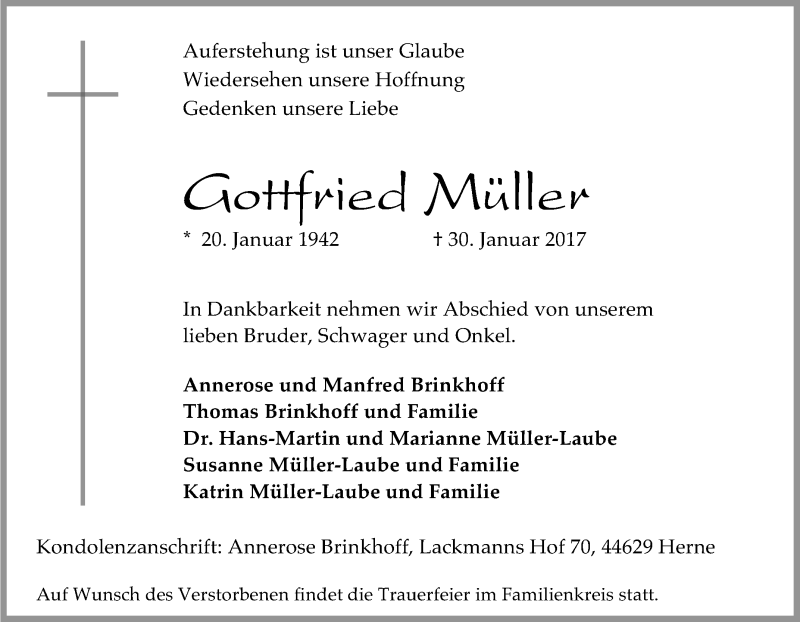 Hier finden Sie alle Traueranzeigen aus der Zeitung, die bisher für Gottfried Müller erschienen sind. Weitere Traueranzeigen, die in der Zeitung erscheinen, werden hier ebenfalls aufgelistet