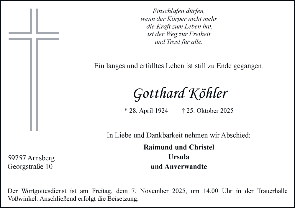 Hier finden Sie alle Traueranzeigen aus der Zeitung, die bisher für Gotthard Köhler erschienen sind. Weitere Traueranzeigen, die in der Zeitung erscheinen, werden hier ebenfalls aufgelistet