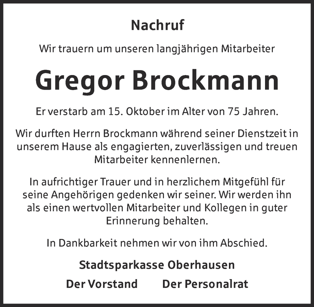 Hier finden Sie alle Traueranzeigen aus der Zeitung, die bisher für Gregor Brockmann erschienen sind. Weitere Traueranzeigen, die in der Zeitung erscheinen, werden hier ebenfalls aufgelistet