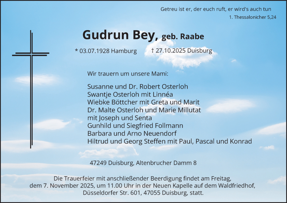 Hier finden Sie alle Traueranzeigen aus der Zeitung, die bisher für Gudrun Bey erschienen sind. Weitere Traueranzeigen, die in der Zeitung erscheinen, werden hier ebenfalls aufgelistet
