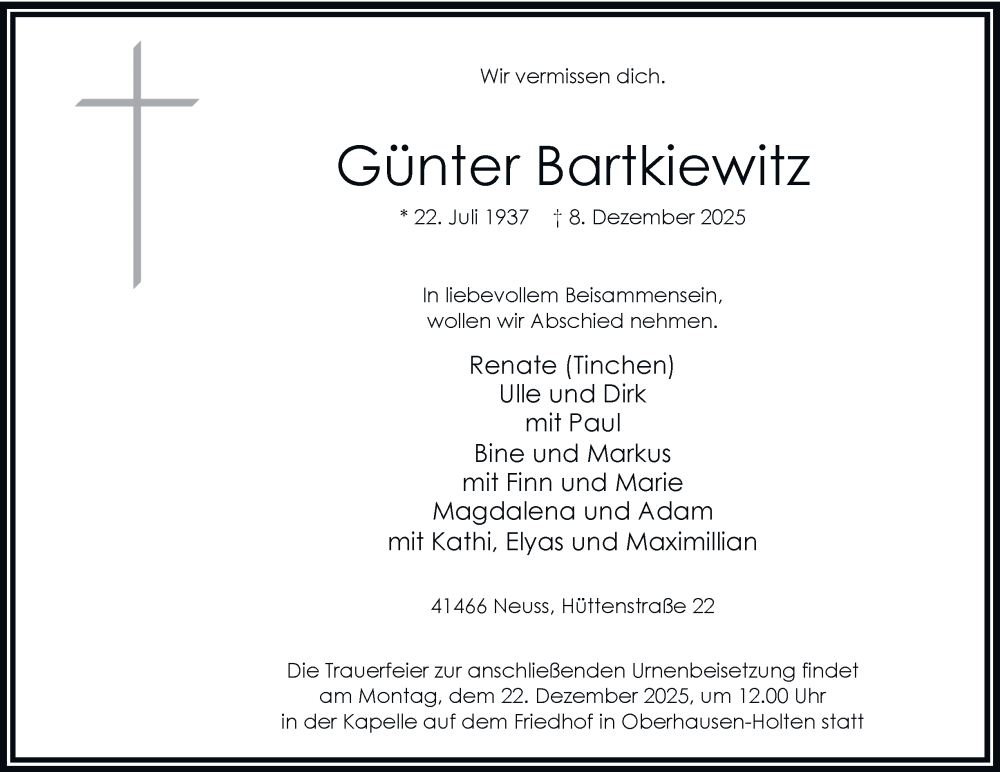 Hier finden Sie alle Traueranzeigen aus der Zeitung, die bisher für Günter Bartkiewitz erschienen sind. Weitere Traueranzeigen, die in der Zeitung erscheinen, werden hier ebenfalls aufgelistet