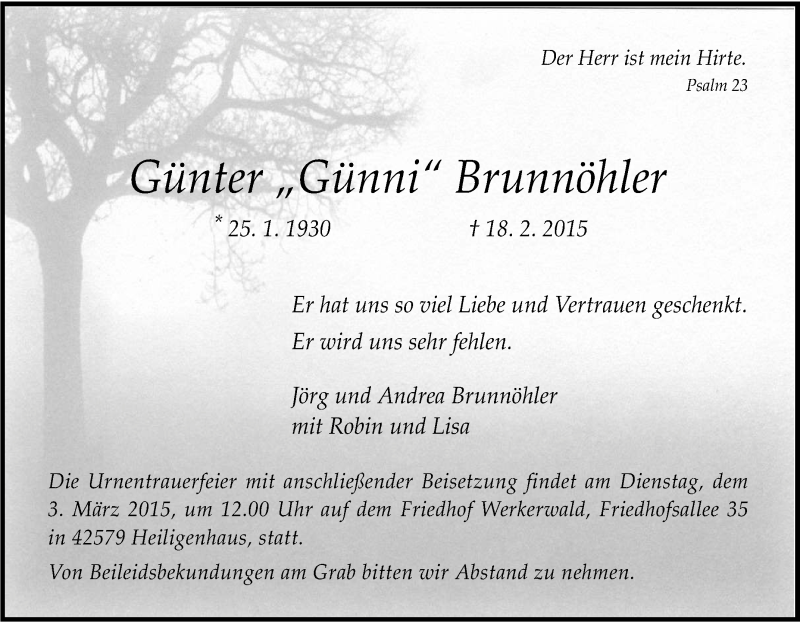 Hier finden Sie alle Traueranzeigen aus der Zeitung, die bisher für Günter Brunnöhler erschienen sind. Weitere Traueranzeigen, die in der Zeitung erscheinen, werden hier ebenfalls aufgelistet