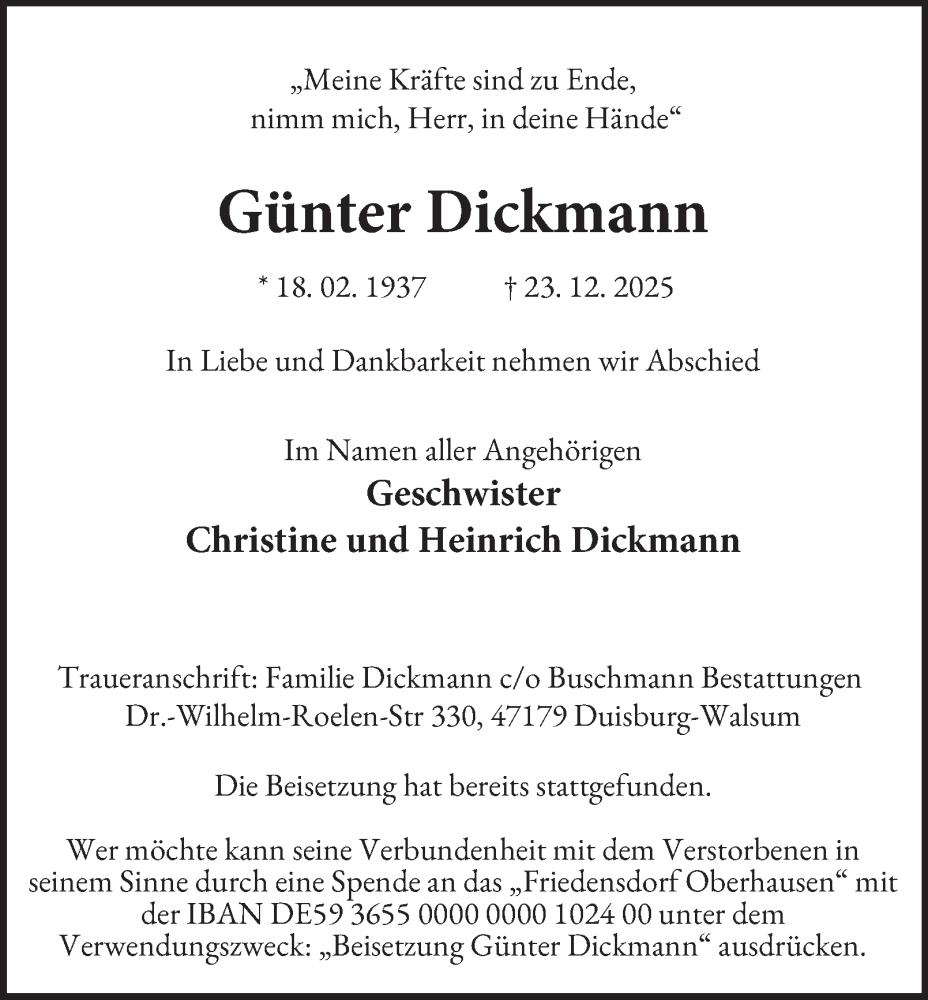 Hier finden Sie alle Traueranzeigen aus der Zeitung, die bisher für Günter Dickmann erschienen sind. Weitere Traueranzeigen, die in der Zeitung erscheinen, werden hier ebenfalls aufgelistet