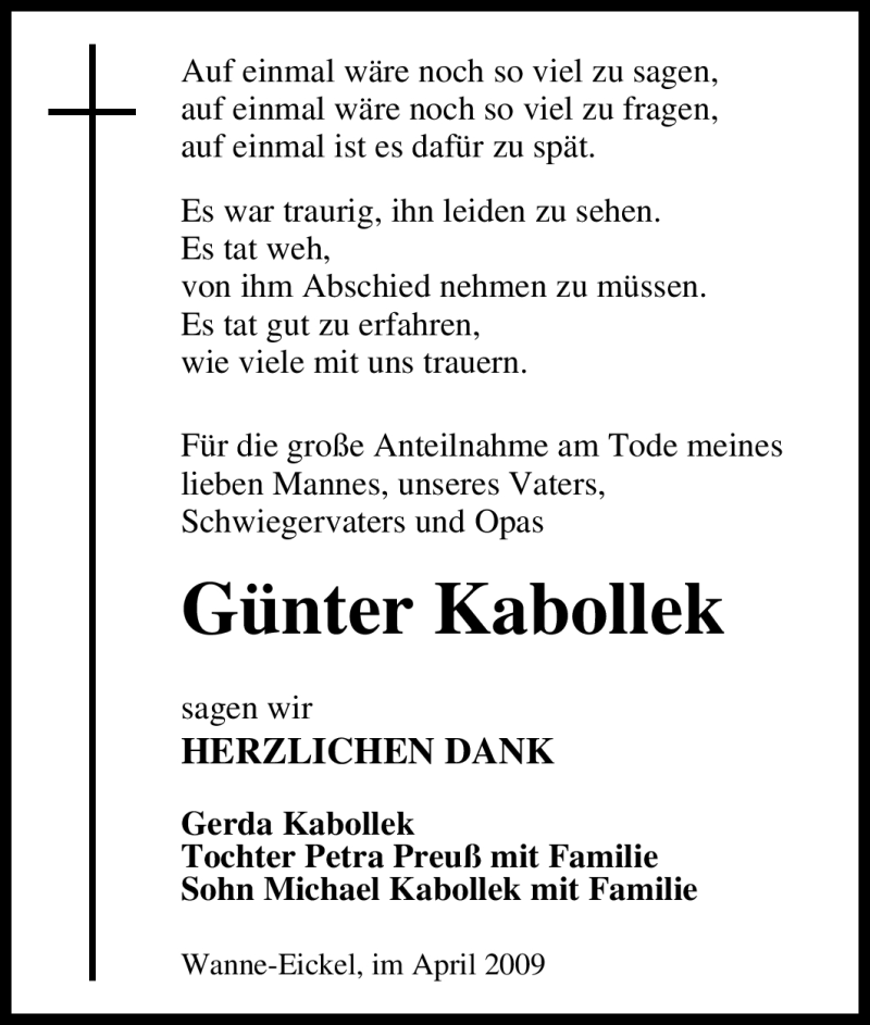 Hier finden Sie alle Traueranzeigen aus der Zeitung, die bisher für Günter Kabollek erschienen sind. Weitere Traueranzeigen, die in der Zeitung erscheinen, werden hier ebenfalls aufgelistet