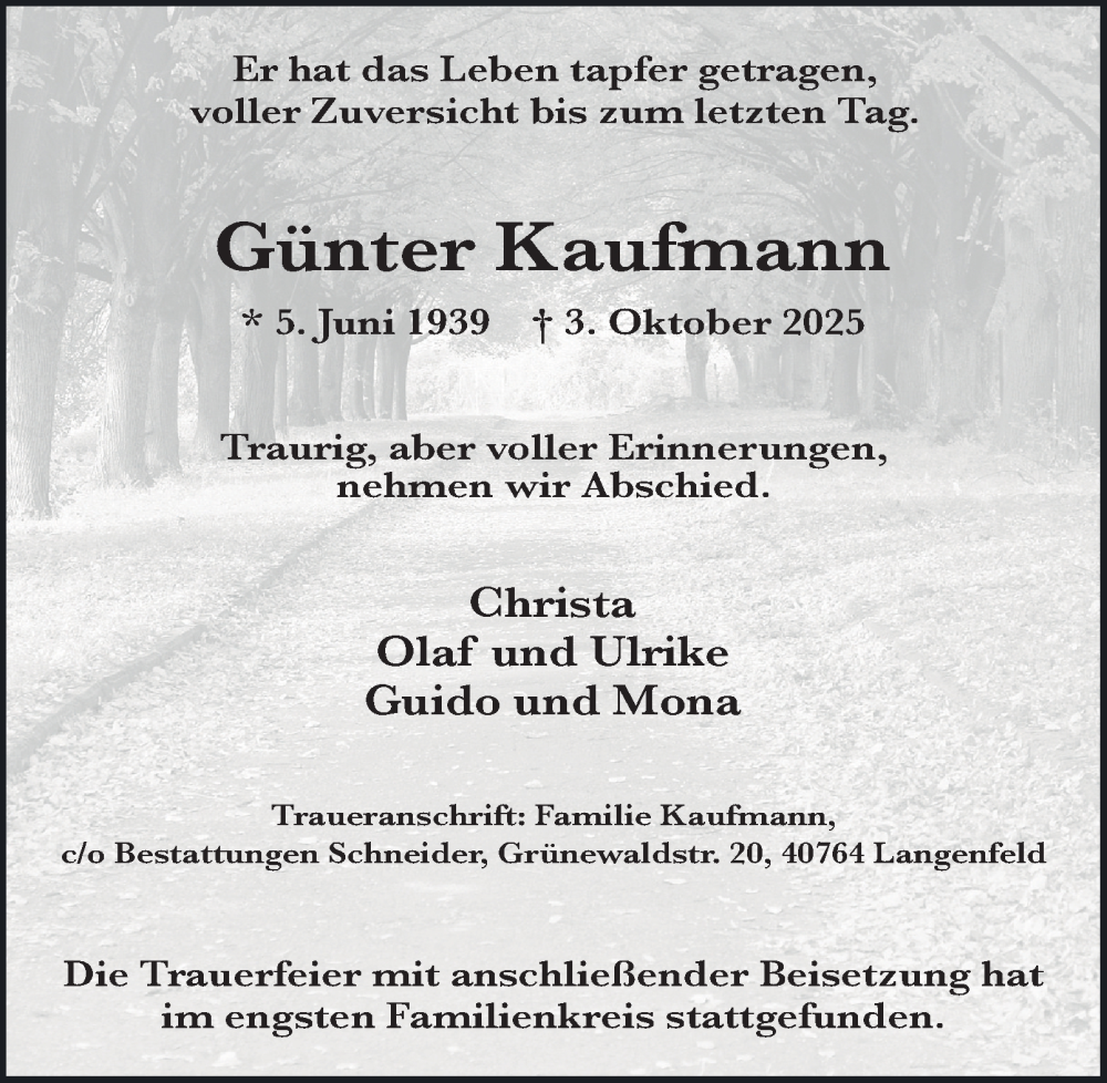Hier finden Sie alle Traueranzeigen aus der Zeitung, die bisher für Günter Kaufmann erschienen sind. Weitere Traueranzeigen, die in der Zeitung erscheinen, werden hier ebenfalls aufgelistet