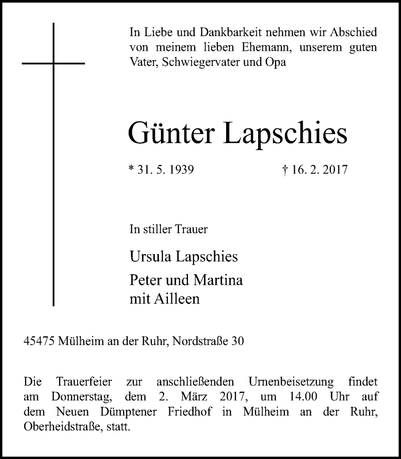 Hier finden Sie alle Traueranzeigen aus der Zeitung, die bisher für Günter Lapschies erschienen sind. Weitere Traueranzeigen, die in der Zeitung erscheinen, werden hier ebenfalls aufgelistet