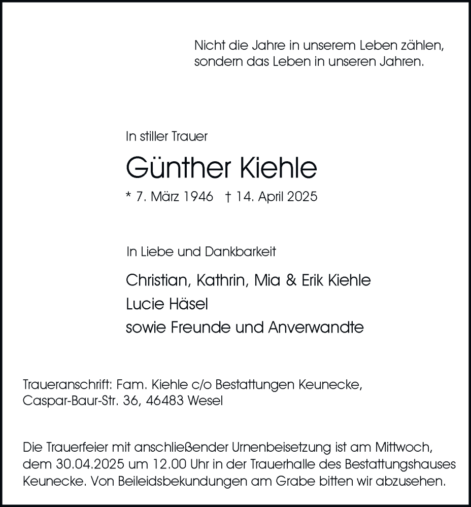 Hier finden Sie alle Traueranzeigen aus der Zeitung, die bisher für Günther Kiehle erschienen sind. Weitere Traueranzeigen, die in der Zeitung erscheinen, werden hier ebenfalls aufgelistet
