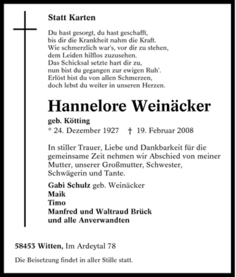 Hier finden Sie alle Traueranzeigen aus der Zeitung, die bisher für Hannelore Weinäcker erschienen sind. Weitere Traueranzeigen, die in der Zeitung erscheinen, werden hier ebenfalls aufgelistet