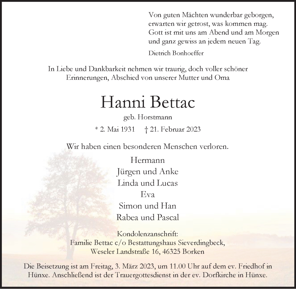 Hier finden Sie alle Traueranzeigen aus der Zeitung, die bisher für Hanni Bettac erschienen sind. Weitere Traueranzeigen, die in der Zeitung erscheinen, werden hier ebenfalls aufgelistet