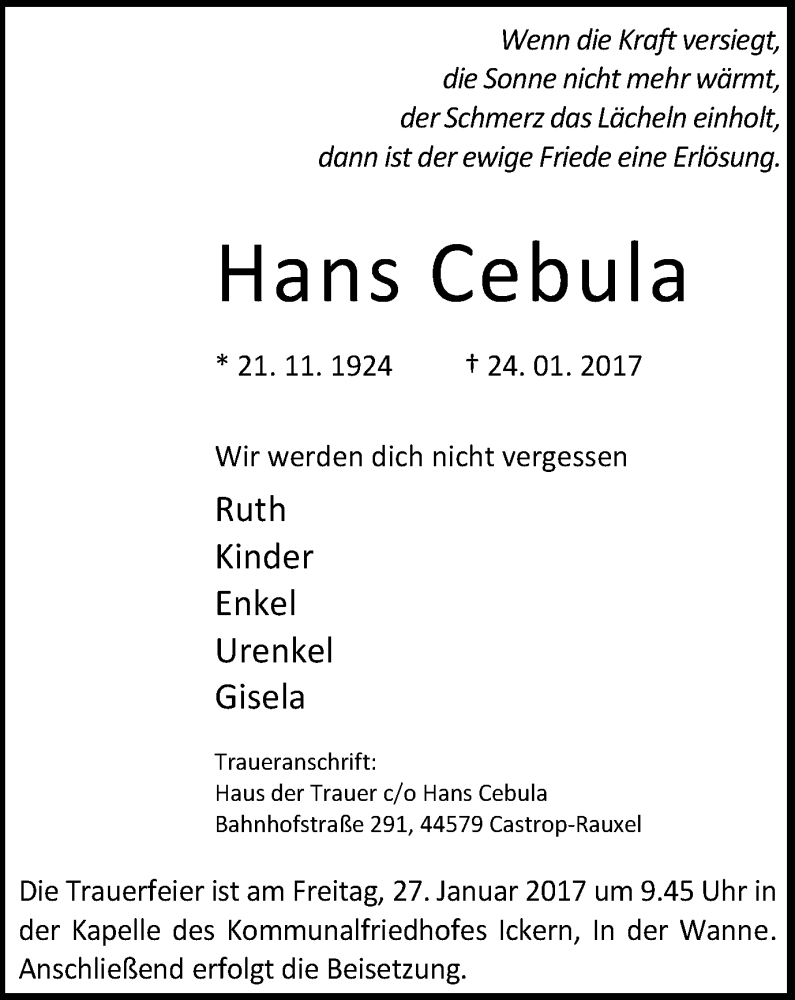 Hier finden Sie alle Traueranzeigen aus der Zeitung, die bisher für Hans Cebula erschienen sind. Weitere Traueranzeigen, die in der Zeitung erscheinen, werden hier ebenfalls aufgelistet