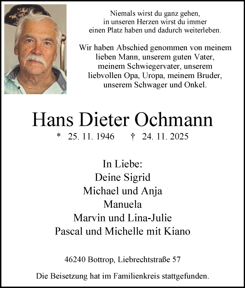 Hier finden Sie alle Traueranzeigen aus der Zeitung, die bisher für Hans Dieter Ochmann erschienen sind. Weitere Traueranzeigen, die in der Zeitung erscheinen, werden hier ebenfalls aufgelistet