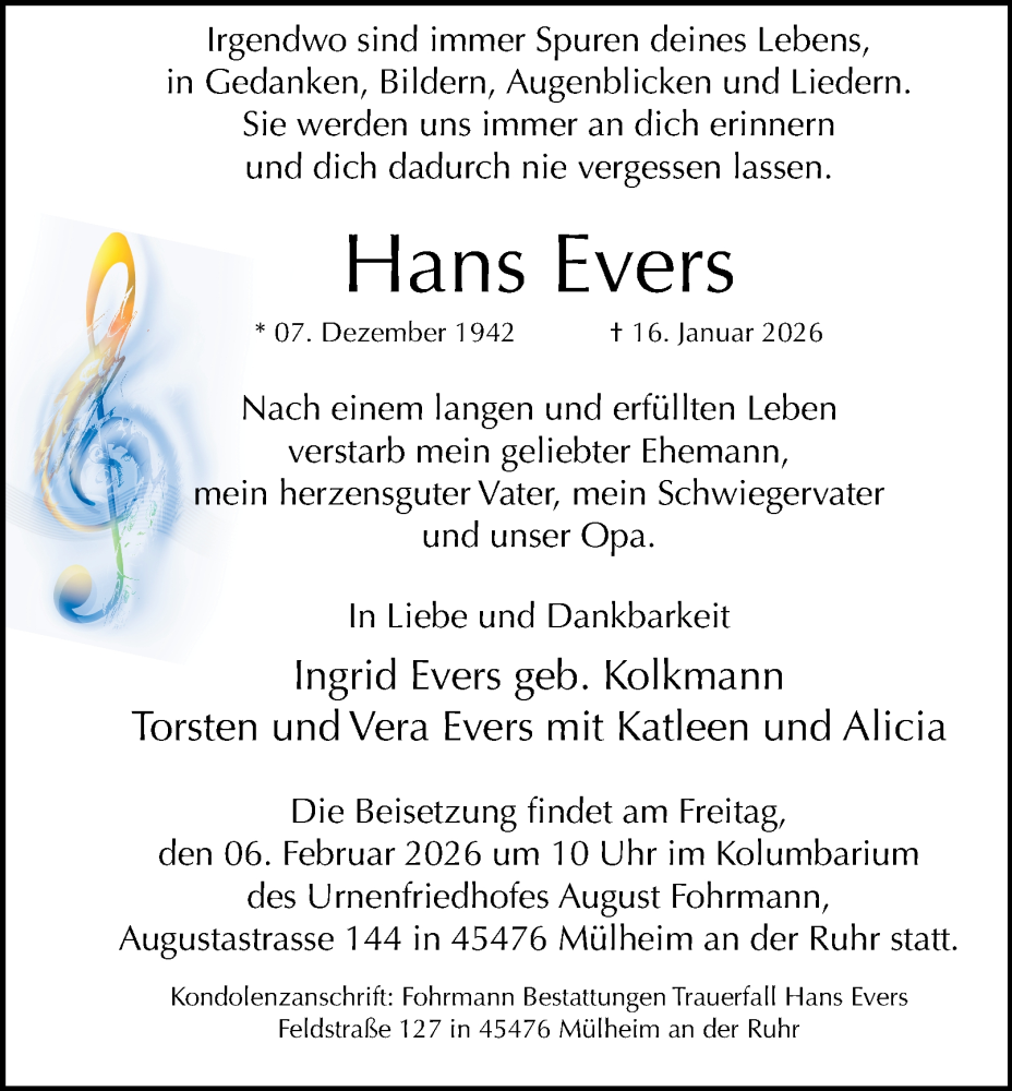 Hier finden Sie alle Traueranzeigen aus der Zeitung, die bisher für Hans Evers erschienen sind. Weitere Traueranzeigen, die in der Zeitung erscheinen, werden hier ebenfalls aufgelistet