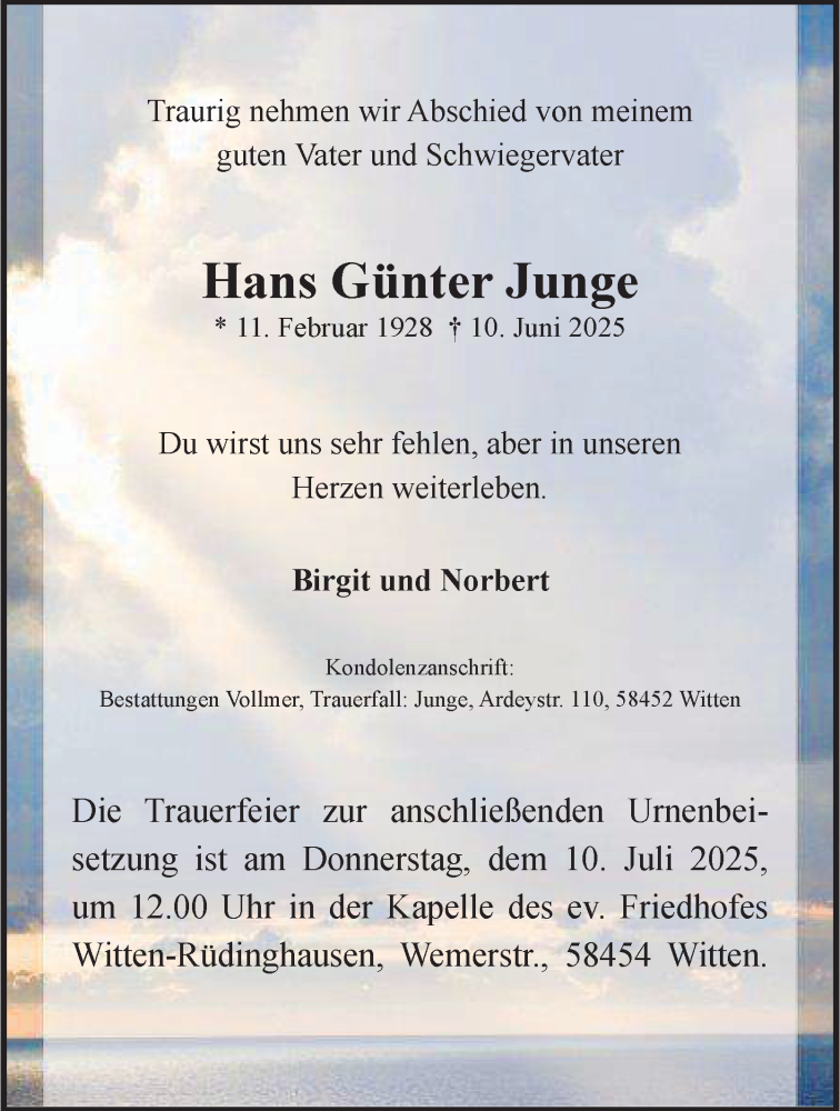 Hier finden Sie alle Traueranzeigen aus der Zeitung, die bisher für Hans Günter Junge erschienen sind. Weitere Traueranzeigen, die in der Zeitung erscheinen, werden hier ebenfalls aufgelistet