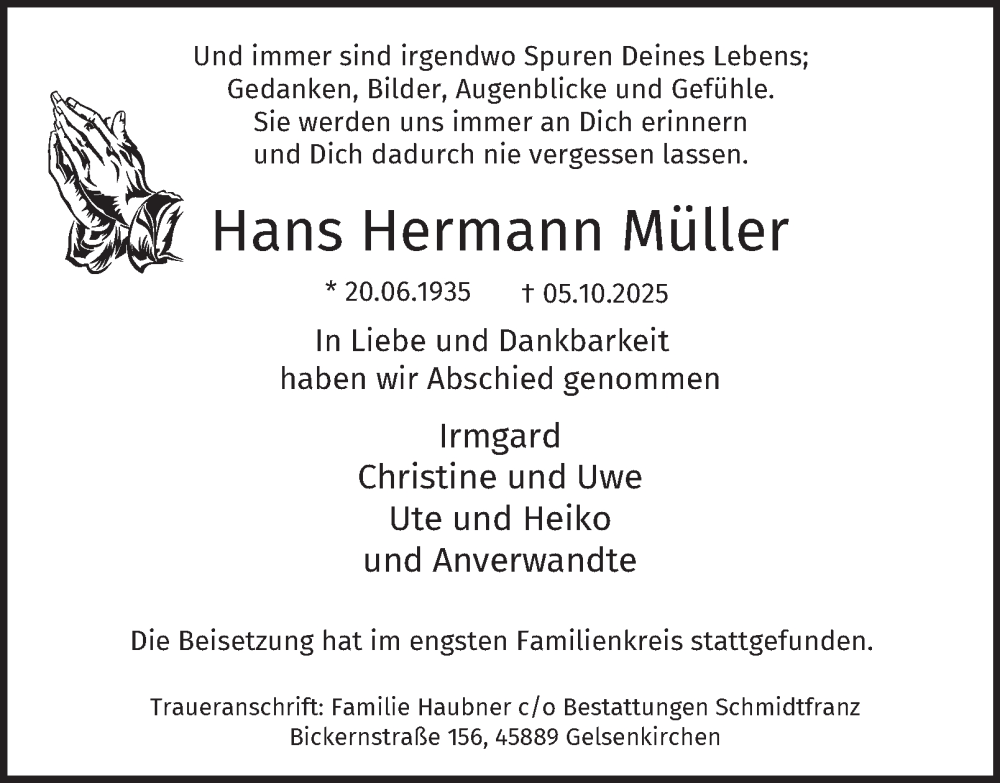 Hier finden Sie alle Traueranzeigen aus der Zeitung, die bisher für Hans Hermann Müller erschienen sind. Weitere Traueranzeigen, die in der Zeitung erscheinen, werden hier ebenfalls aufgelistet