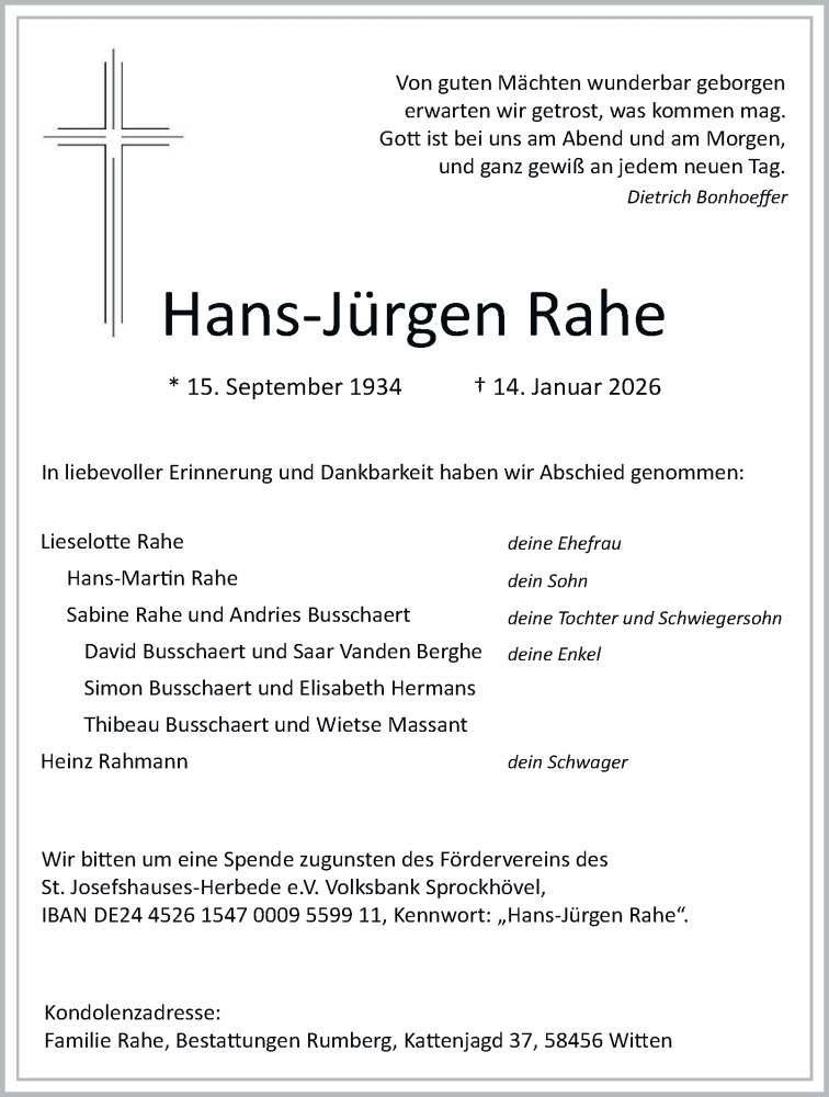 Hier finden Sie alle Traueranzeigen aus der Zeitung, die bisher für Hans-Jürgen Rahe erschienen sind. Weitere Traueranzeigen, die in der Zeitung erscheinen, werden hier ebenfalls aufgelistet
