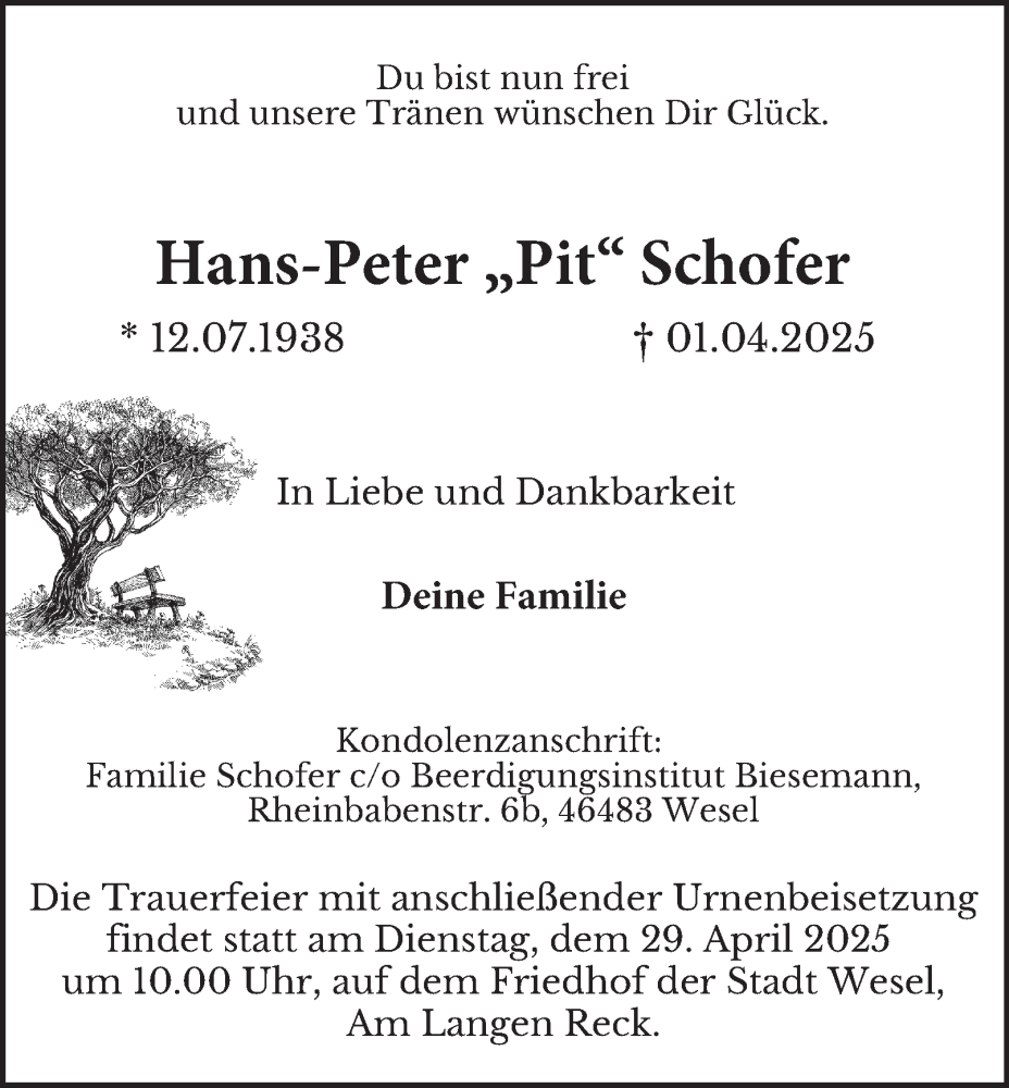 Hier finden Sie alle Traueranzeigen aus der Zeitung, die bisher für Hans-Peter Schofer erschienen sind. Weitere Traueranzeigen, die in der Zeitung erscheinen, werden hier ebenfalls aufgelistet