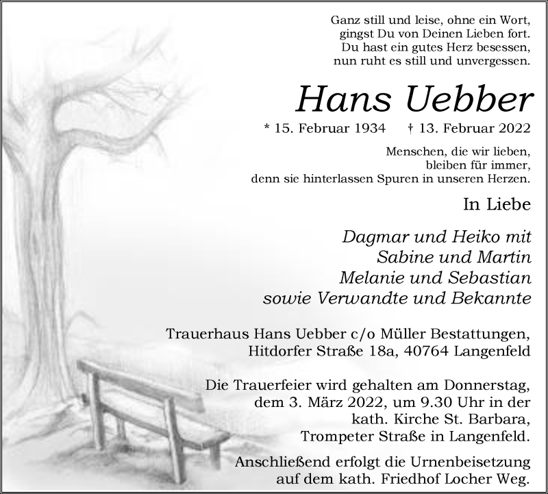 Hier finden Sie alle Traueranzeigen aus der Zeitung, die bisher für Hans Uebber erschienen sind. Weitere Traueranzeigen, die in der Zeitung erscheinen, werden hier ebenfalls aufgelistet