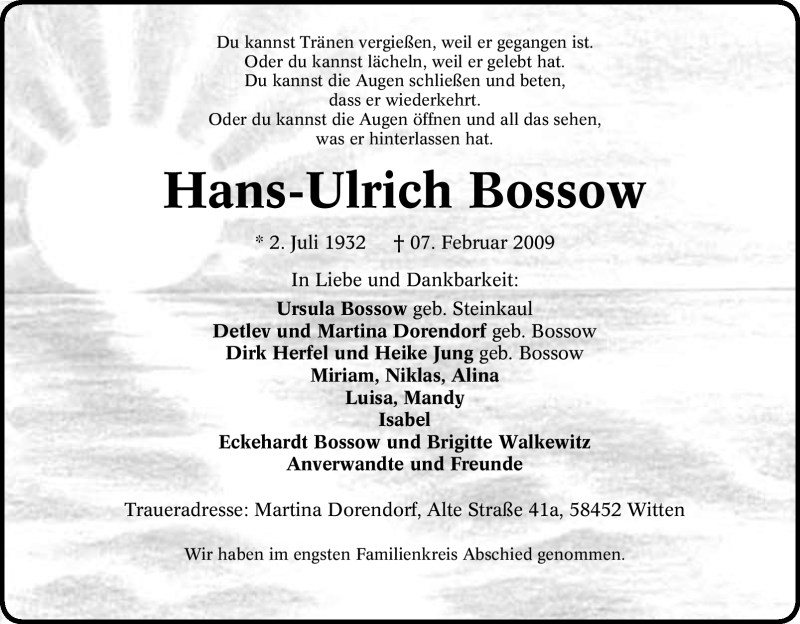 Hier finden Sie alle Traueranzeigen aus der Zeitung, die bisher für Hans-Ulrich Bossow erschienen sind. Weitere Traueranzeigen, die in der Zeitung erscheinen, werden hier ebenfalls aufgelistet