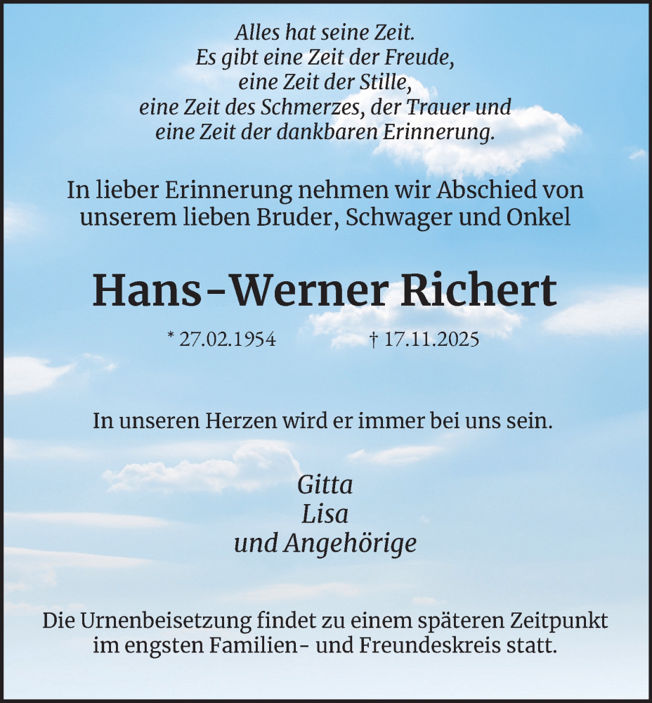 Hier finden Sie alle Traueranzeigen aus der Zeitung, die bisher für Hans-Werner Richert erschienen sind. Weitere Traueranzeigen, die in der Zeitung erscheinen, werden hier ebenfalls aufgelistet