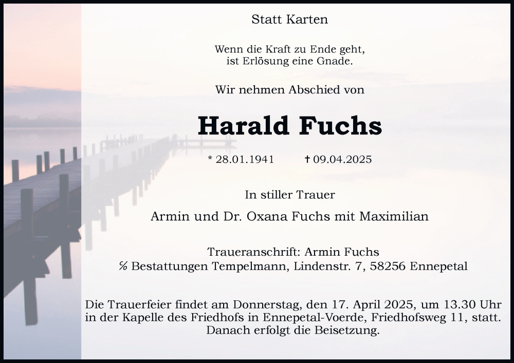 Hier finden Sie alle Traueranzeigen aus der Zeitung, die bisher für Harald Fuchs erschienen sind. Weitere Traueranzeigen, die in der Zeitung erscheinen, werden hier ebenfalls aufgelistet