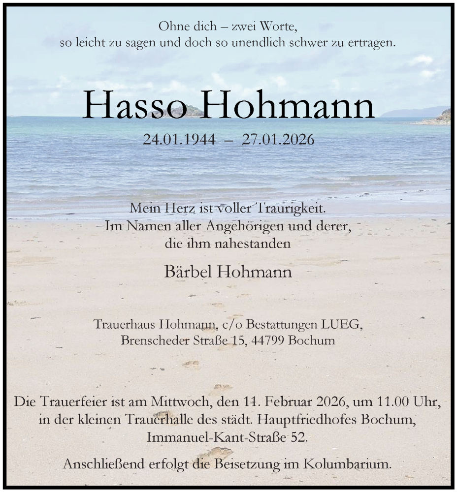 Hier finden Sie alle Traueranzeigen aus der Zeitung, die bisher für Hasso Hohmann erschienen sind. Weitere Traueranzeigen, die in der Zeitung erscheinen, werden hier ebenfalls aufgelistet