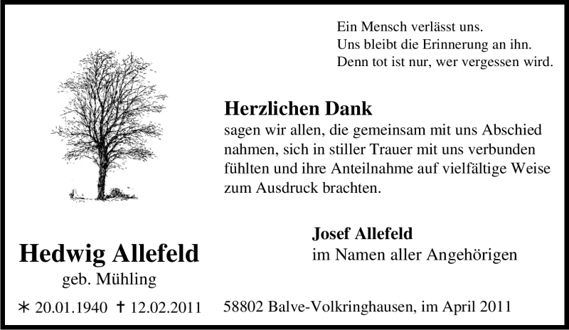 Hier finden Sie alle Traueranzeigen aus der Zeitung, die bisher für Hedwig Allefeld erschienen sind. Weitere Traueranzeigen, die in der Zeitung erscheinen, werden hier ebenfalls aufgelistet