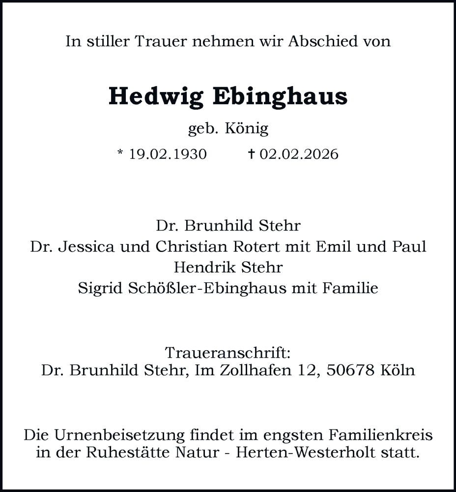 Hier finden Sie alle Traueranzeigen aus der Zeitung, die bisher für Hedwig Ebinghaus erschienen sind. Weitere Traueranzeigen, die in der Zeitung erscheinen, werden hier ebenfalls aufgelistet