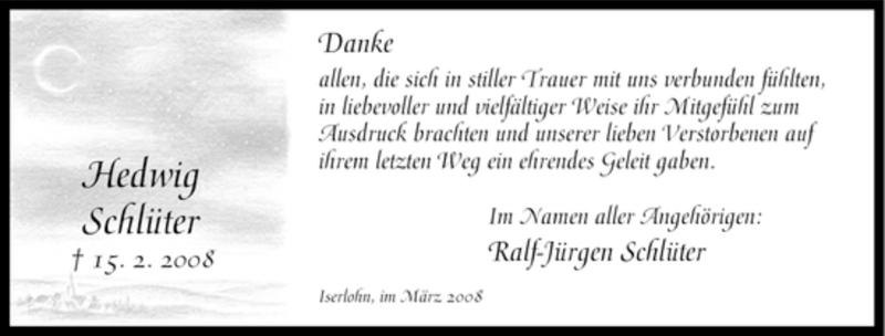 Hier finden Sie alle Traueranzeigen aus der Zeitung, die bisher für Hedwig Schlüter erschienen sind. Weitere Traueranzeigen, die in der Zeitung erscheinen, werden hier ebenfalls aufgelistet