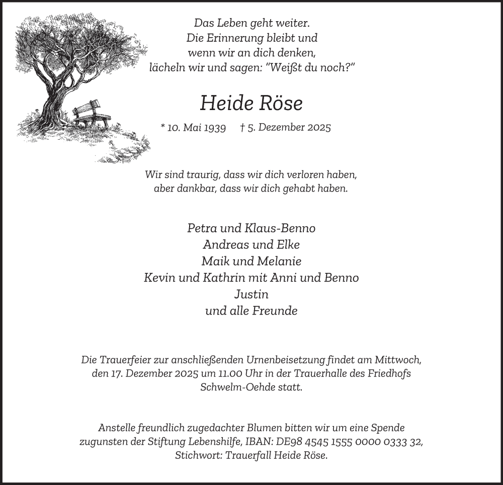 Hier finden Sie alle Traueranzeigen aus der Zeitung, die bisher für Heide Röse erschienen sind. Weitere Traueranzeigen, die in der Zeitung erscheinen, werden hier ebenfalls aufgelistet