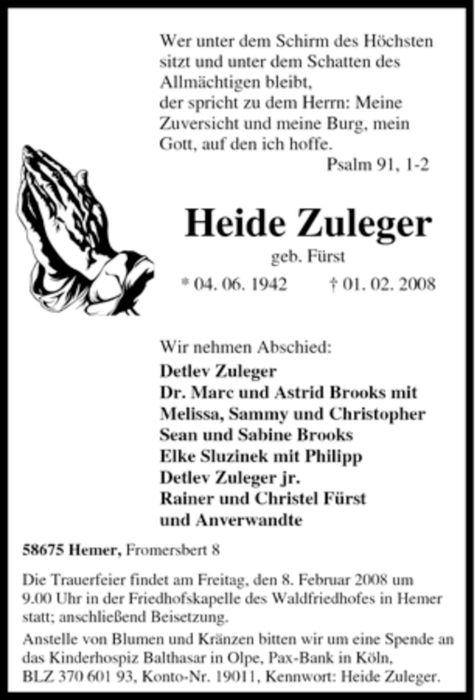 Hier finden Sie alle Traueranzeigen aus der Zeitung, die bisher für Heide Zuleger erschienen sind. Weitere Traueranzeigen, die in der Zeitung erscheinen, werden hier ebenfalls aufgelistet