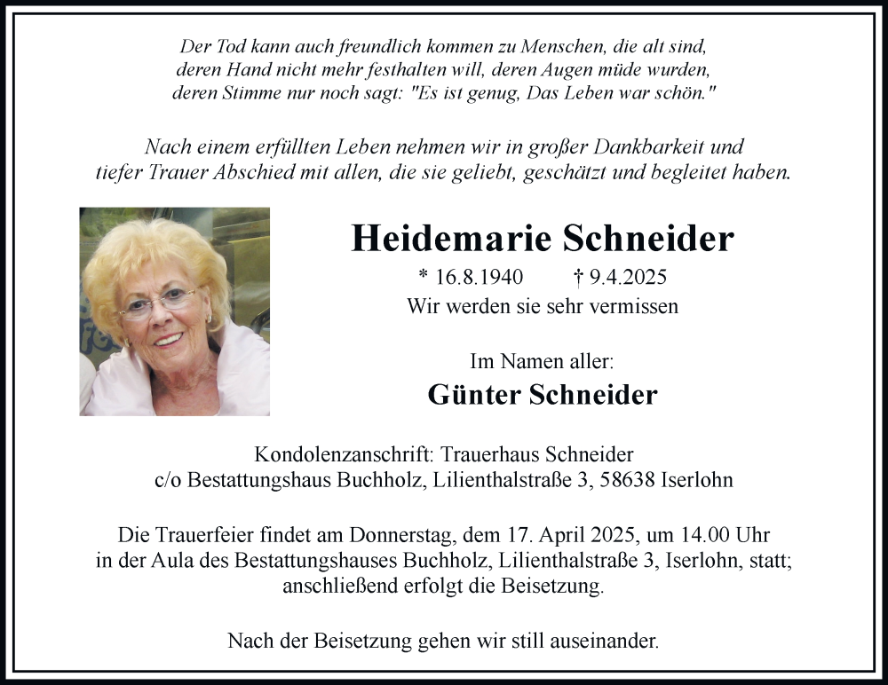 Hier finden Sie alle Traueranzeigen aus der Zeitung, die bisher für Heidemarie Schneider erschienen sind. Weitere Traueranzeigen, die in der Zeitung erscheinen, werden hier ebenfalls aufgelistet