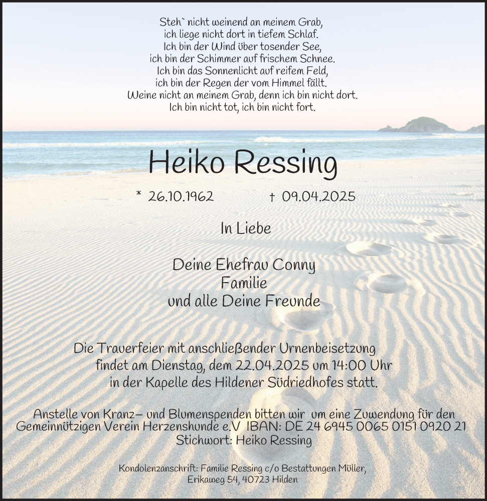 Hier finden Sie alle Traueranzeigen aus der Zeitung, die bisher für Heiko Ressing erschienen sind. Weitere Traueranzeigen, die in der Zeitung erscheinen, werden hier ebenfalls aufgelistet