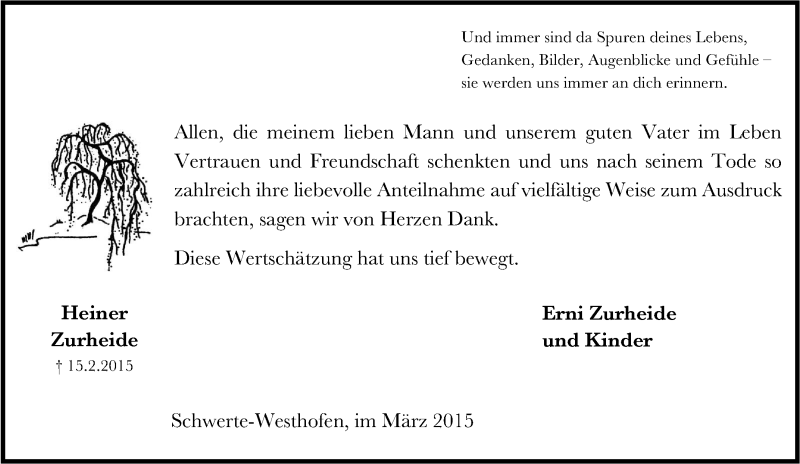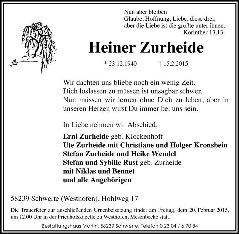 Hier finden Sie alle Traueranzeigen aus der Zeitung, die bisher für Heiner Zurheide erschienen sind. Weitere Traueranzeigen, die in der Zeitung erscheinen, werden hier ebenfalls aufgelistet