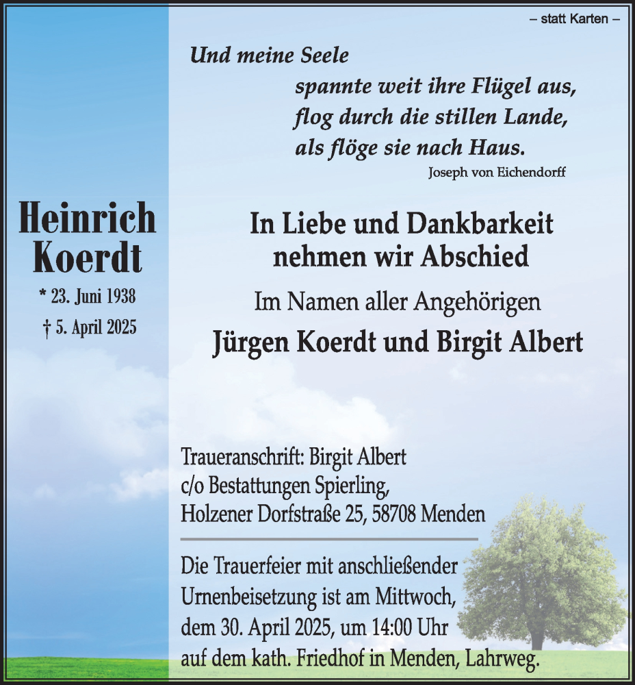 Hier finden Sie alle Traueranzeigen aus der Zeitung, die bisher für Heinrich Koerdt erschienen sind. Weitere Traueranzeigen, die in der Zeitung erscheinen, werden hier ebenfalls aufgelistet
