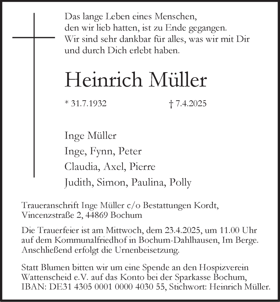 Hier finden Sie alle Traueranzeigen aus der Zeitung, die bisher für Heinrich Müller erschienen sind. Weitere Traueranzeigen, die in der Zeitung erscheinen, werden hier ebenfalls aufgelistet
