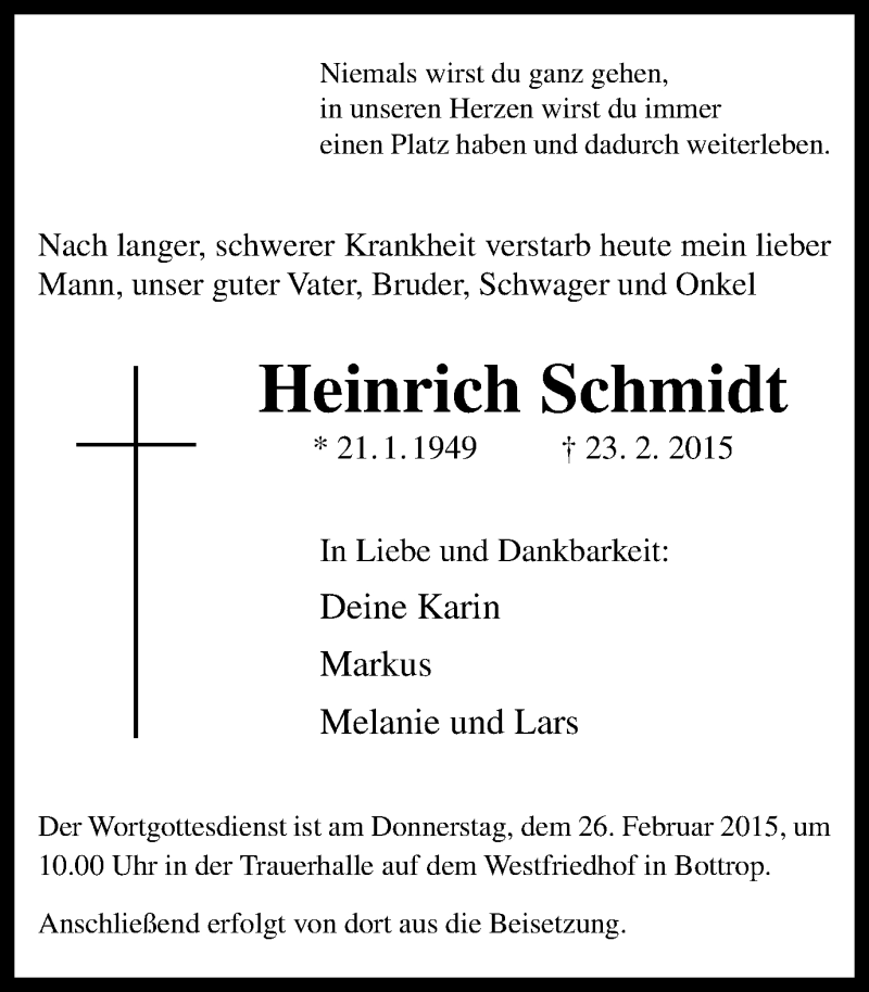 Hier finden Sie alle Traueranzeigen aus der Zeitung, die bisher für Heinrich Schmidt erschienen sind. Weitere Traueranzeigen, die in der Zeitung erscheinen, werden hier ebenfalls aufgelistet