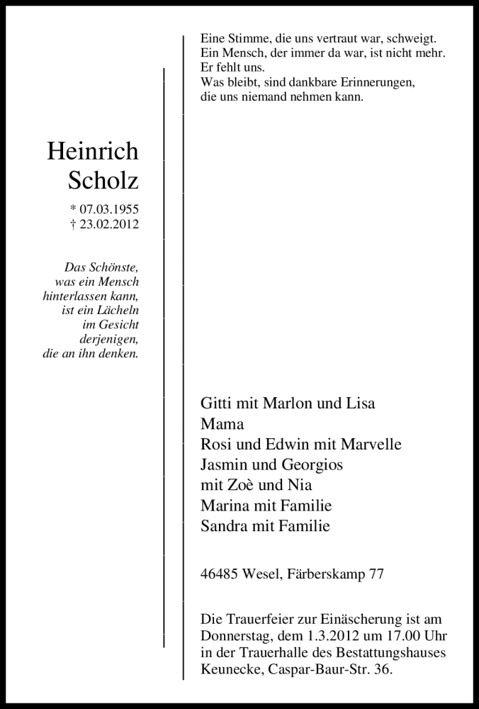 Hier finden Sie alle Traueranzeigen aus der Zeitung, die bisher für Heinrich Scholz erschienen sind. Weitere Traueranzeigen, die in der Zeitung erscheinen, werden hier ebenfalls aufgelistet