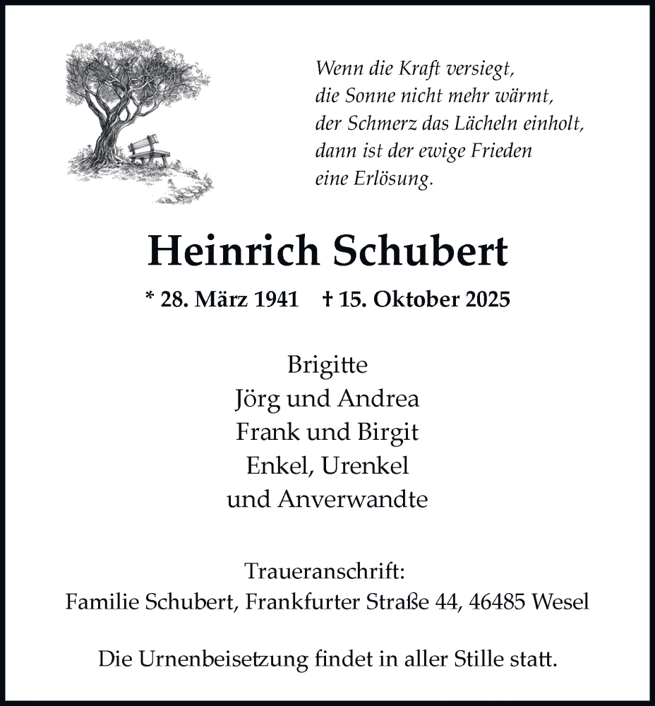 Hier finden Sie alle Traueranzeigen aus der Zeitung, die bisher für Heinrich Schubert erschienen sind. Weitere Traueranzeigen, die in der Zeitung erscheinen, werden hier ebenfalls aufgelistet