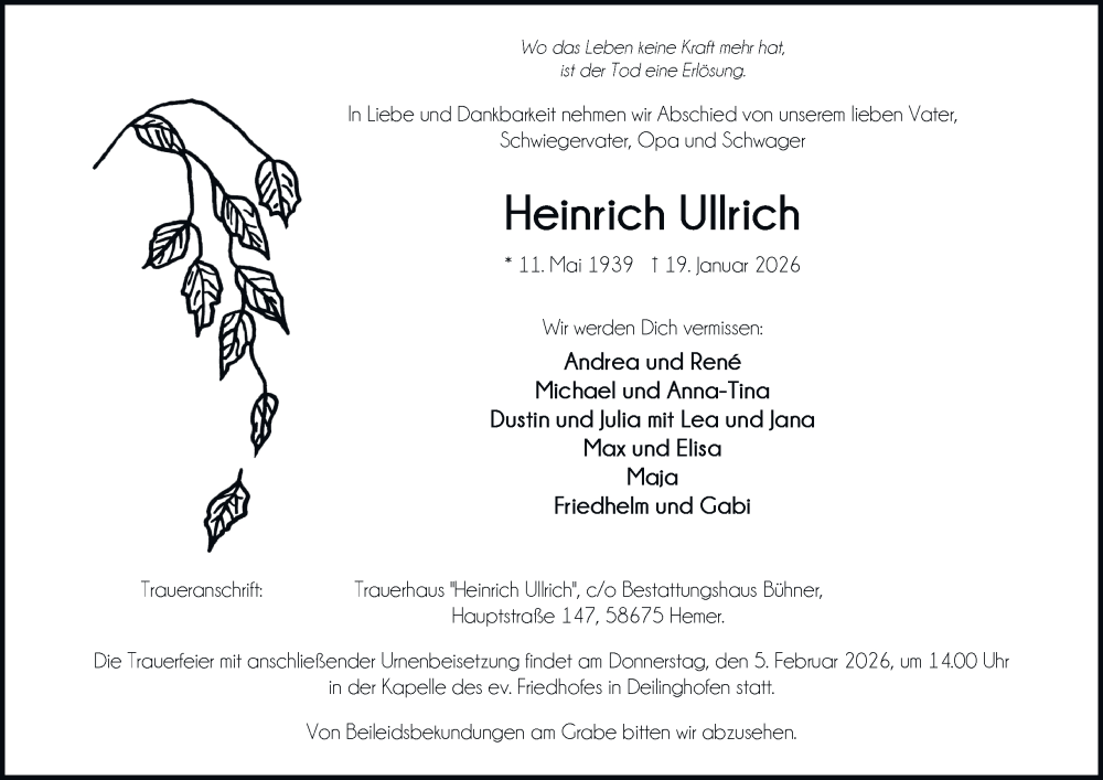 Hier finden Sie alle Traueranzeigen aus der Zeitung, die bisher für Heinrich Ullrich erschienen sind. Weitere Traueranzeigen, die in der Zeitung erscheinen, werden hier ebenfalls aufgelistet