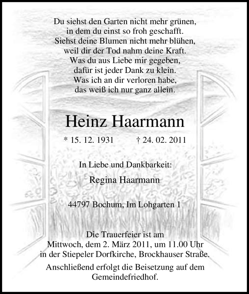 Hier finden Sie alle Traueranzeigen aus der Zeitung, die bisher für Heinz Haarmann erschienen sind. Weitere Traueranzeigen, die in der Zeitung erscheinen, werden hier ebenfalls aufgelistet