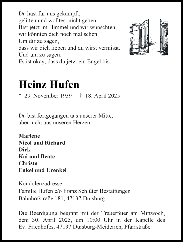 Hier finden Sie alle Traueranzeigen aus der Zeitung, die bisher für Heinz Hufen erschienen sind. Weitere Traueranzeigen, die in der Zeitung erscheinen, werden hier ebenfalls aufgelistet
