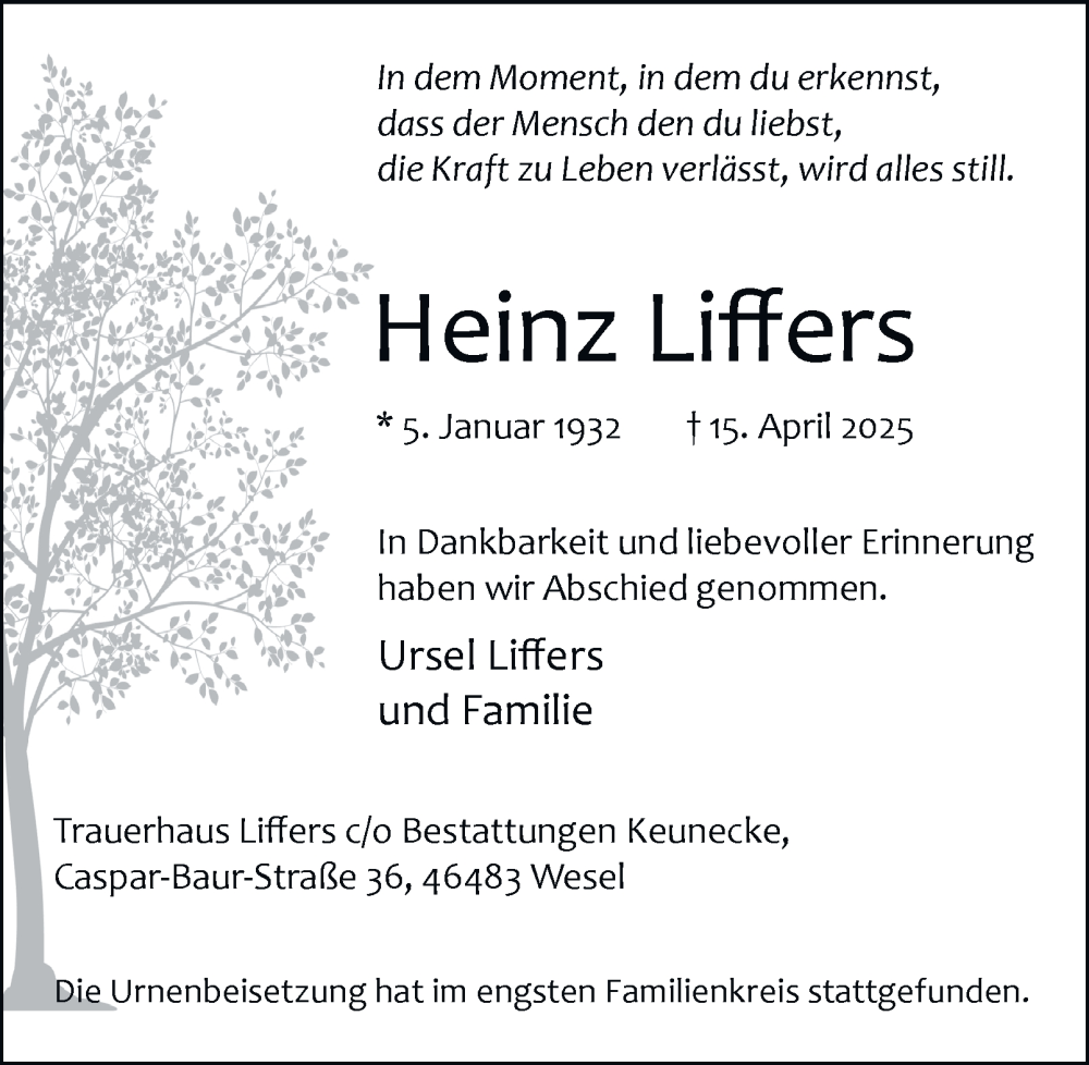 Hier finden Sie alle Traueranzeigen aus der Zeitung, die bisher für Heinz Liffers erschienen sind. Weitere Traueranzeigen, die in der Zeitung erscheinen, werden hier ebenfalls aufgelistet