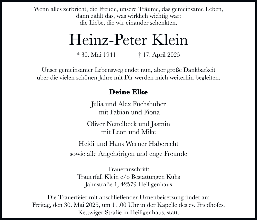 Hier finden Sie alle Traueranzeigen aus der Zeitung, die bisher für Heinz-Peter Klein erschienen sind. Weitere Traueranzeigen, die in der Zeitung erscheinen, werden hier ebenfalls aufgelistet