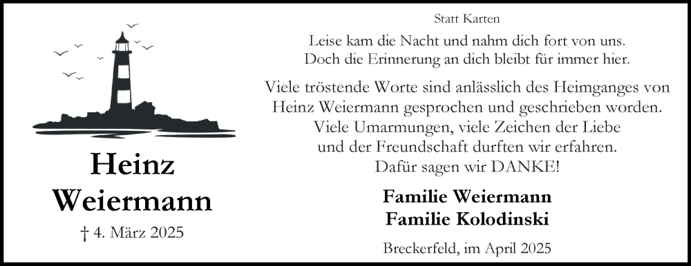Hier finden Sie alle Traueranzeigen aus der Zeitung, die bisher für Heinz Weiermann erschienen sind. Weitere Traueranzeigen, die in der Zeitung erscheinen, werden hier ebenfalls aufgelistet